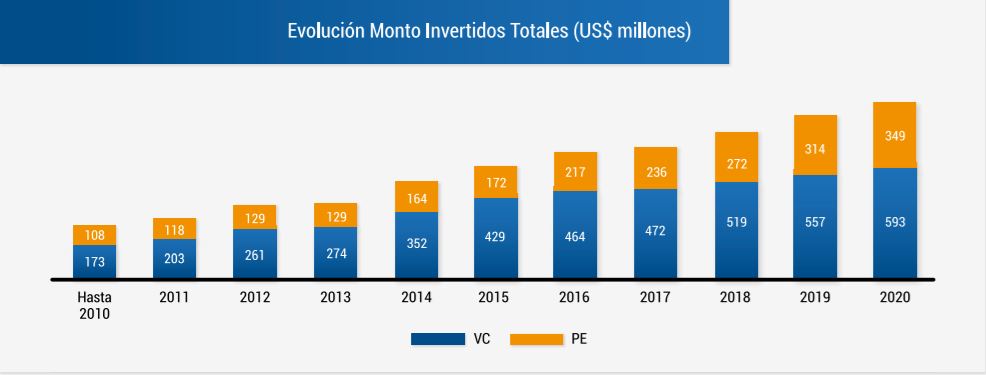 «Se ha invertido un total de US$ 942 millones, considerando aportes privados y aportes CORFO, representados en un 63% por fondos de VC y en un 37% por fondos de PE, beneficiando a 374 empresas en total al 2020». Fuente: Reporte de Venture Capital y Private Equity elaborado por Acafi.